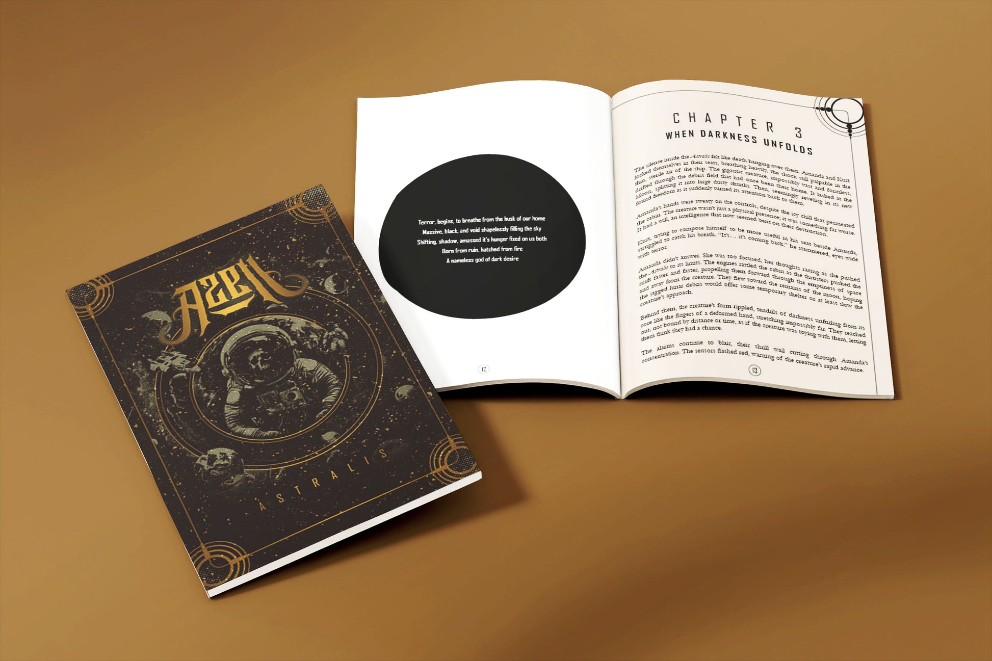 Azell’s Astralis novella is a 60-page companion story that expands the world of the concept album, diving deeper into the psychological unraveling of two astronauts stranded in the aftermath of Earth’s destruction.